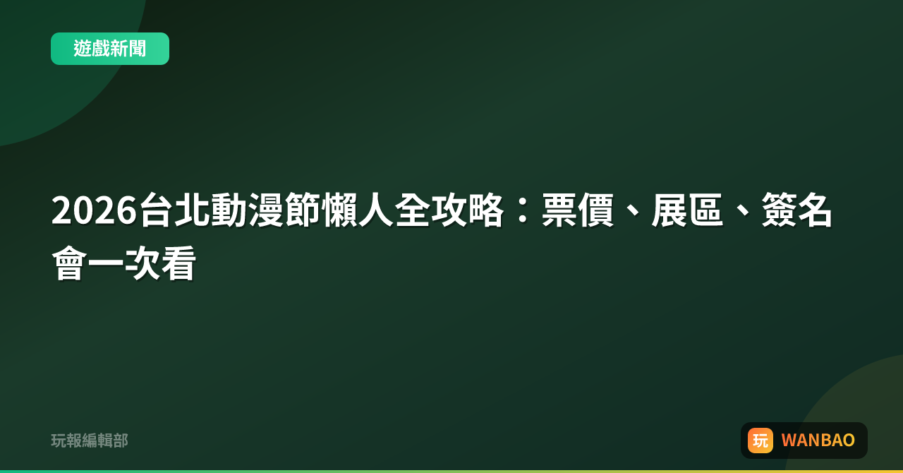 小編今天要帶大家衝刺2026台北國際動漫節的全套懶人包。自從去年疫情後,台北動漫節終於恢復實體舉辦,從開幕式到閉幕煙火,每一步都像是玩家們的「終極任務」。不管你是拳祭老鳥、萌系少女,或是首次踏入展會的新手,這篇一次看完保證讓你不再手忙腳亂,直接衝到想看的攤位、排到最前排的簽名會! 先說說票價吧。這次主展票分為早鳥、一般、夜間三種,早鳥票僅售NT$800(含租借儲物櫃),一般票NT$1,100,夜...