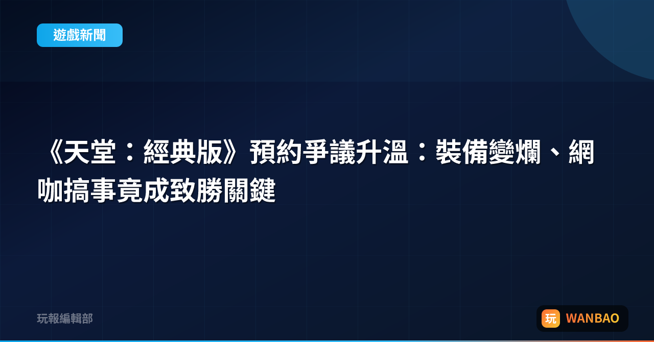 大家好,我是玩報編輯部的「小編」!自從《天堂:經典版》官宣要在近期回歸,我們的心情跟打開寶箱一樣充滿期待。可就在上線倒數幾天,預約禮包的內容竟然被爆出「變爛」——原本宣稱的高階裝備變成了基礎版,這波風波立刻在玩家社群掀起海嘯。更離譜的是,官方同時推出的全台網咖排位賽,竟被發現與課長排行榜緊密掛鉤,讓人懷疑這背後是否藏有「先手」策略。 先說說為什麼大家對這件事這麼在意。《天堂》系列在台灣有長達十幾...